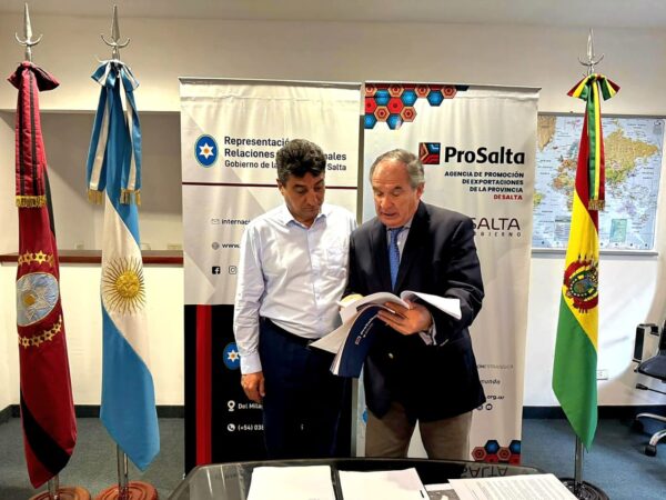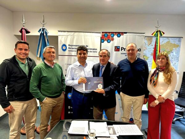 El Representante de Relaciones Internacionales y Presidente de ProSalta, Dr Julio Argentino San Millán, mantuvo una reunión con el Alcalde de Tarija, Johnny Marcel Torres, quien estuvo acompañado por su Asesor Gabriel Ruiz, y el empresario salteño Víctor Ortiz Larran. El objetivo del encuentro fue profundizar la integración regional, fortalecer los lazos de hermandad que unen a ambos pueblos y consolidar una agenda común de desarrollo entre Tarija y Salta. En este marco, se conversó sobre la posibilidad de fomentar la incorporación de productos salteños en el territorio de Tarija para su comercialización local, así como su proyección hacia el resto de Bolivia y otros mercados. En este sentido, el Alcalde Torres manifestó que se encuentran trabajando en una iniciativa que permita el ingreso de maíz transgénico desde Salta, con la posibilidad de establecer un centro de acopio y distribución en Tarija. Para ello,es necesario que Bolivia elimine las restricciones relativas al comercio de granos transgénicos a nivel nacional. Se destacó la sintonía de trabajo actual, ya que tanto desde la Representación de Relaciones Internacionales como desde el Ministerio de Producción y Minería se impulsa una agenda orientada a fortalecer los vínculos con los tres países limítrofes, con especial énfasis en Tarija por la historia común que une a ambas regiones. Cabe destacar que el alcalde de Tarija pertenece al histórico partido del Movimiento Nacionalista Revolucionario -MNR- de Bolivia y es un dirigente político con una extensa trayectoria, incluyendo su desempeño como Diputado Nacional y subgobernador de la Provincia Cercado. Actualmente se encuentra iniciando su segundo mandato como Alcalde Municipal de la ciudad, tras haber finalizado el período 2020-2025. Participaron también el Director de Comercio Exterior y Gerente General de ProSalta, Lic. Sebastián Ashur Mas, y la Coordinadora General de Relaciones Internacionales, Lic. Paz Ibañez.